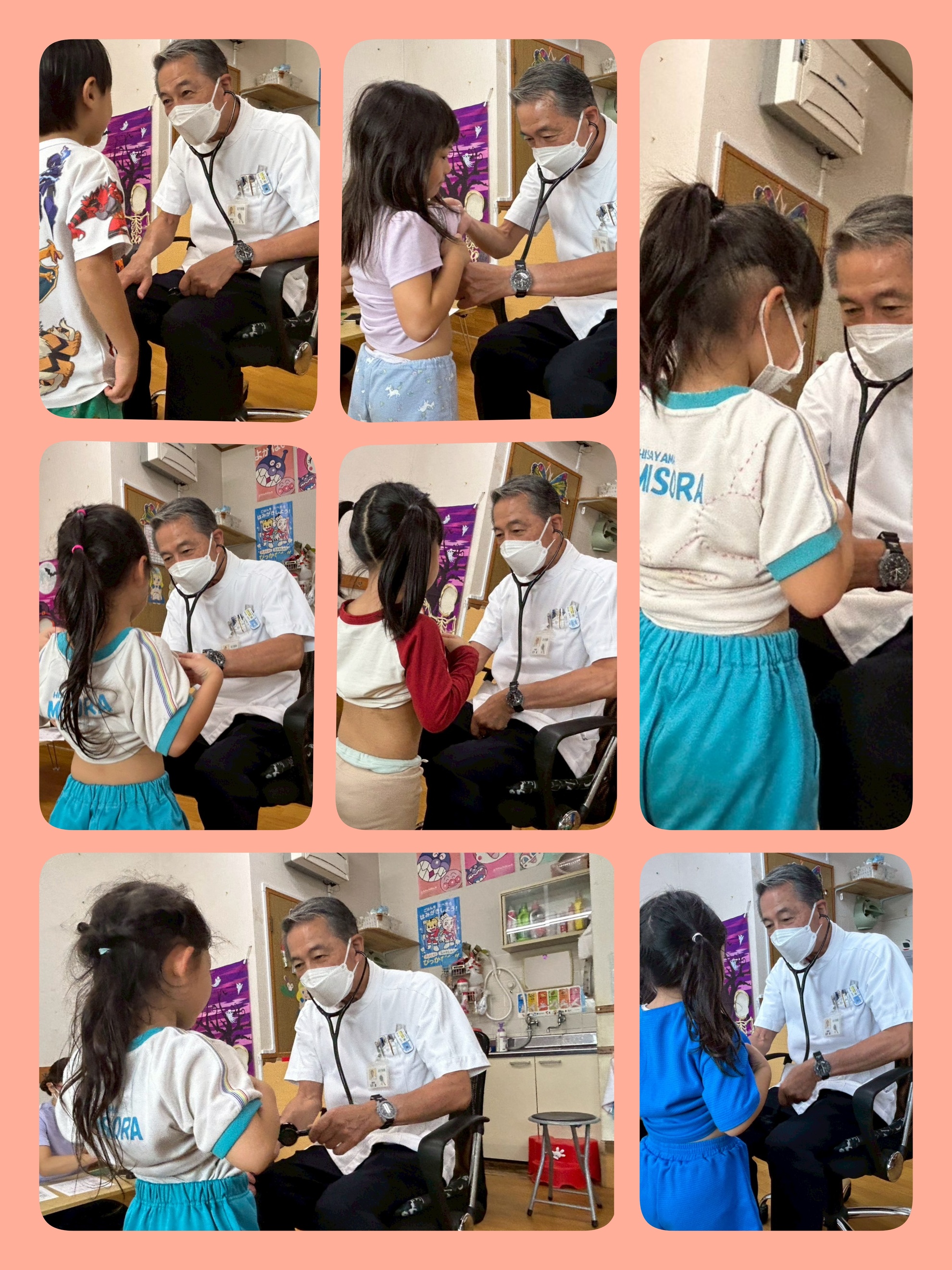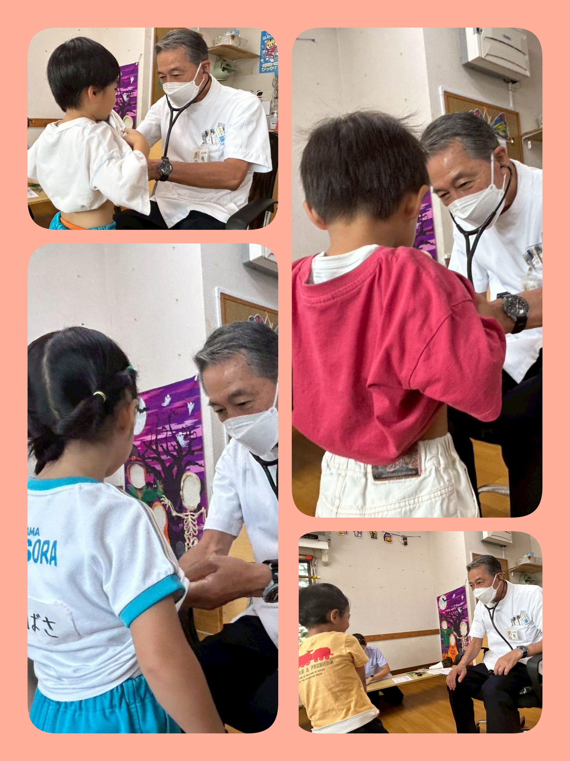 白衣に抵抗があるお友だちも居て 先生が入って来られると ちょっと緊張が走りましたが 大きいお友だちの元気な『おはようございます(. ❛ ᴗ ❛.)』『よろしくお願いします(◍•ᴗ•◍)』の声に 大先生が『おーっ みんな 元気がいいね』と笑顔で声をかけてくださり 雰囲気が一瞬で和みました( ꈍᴗꈍ)