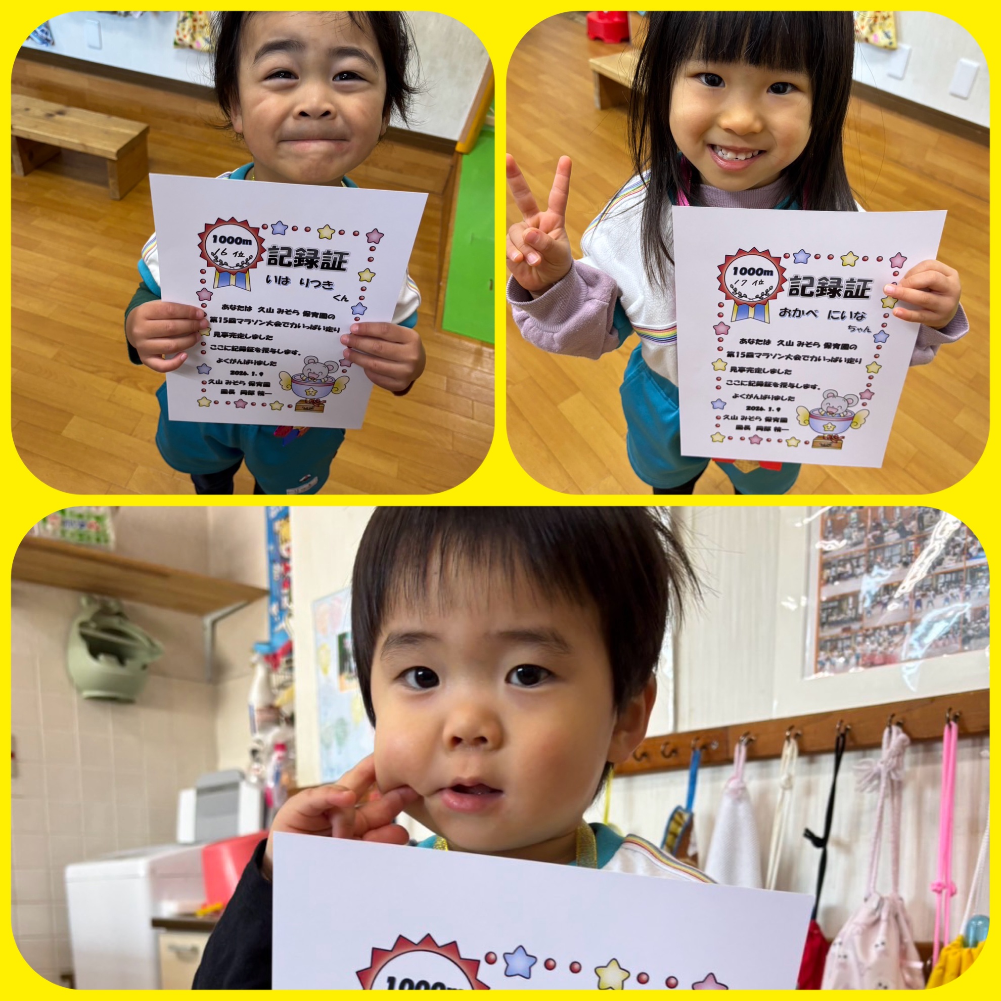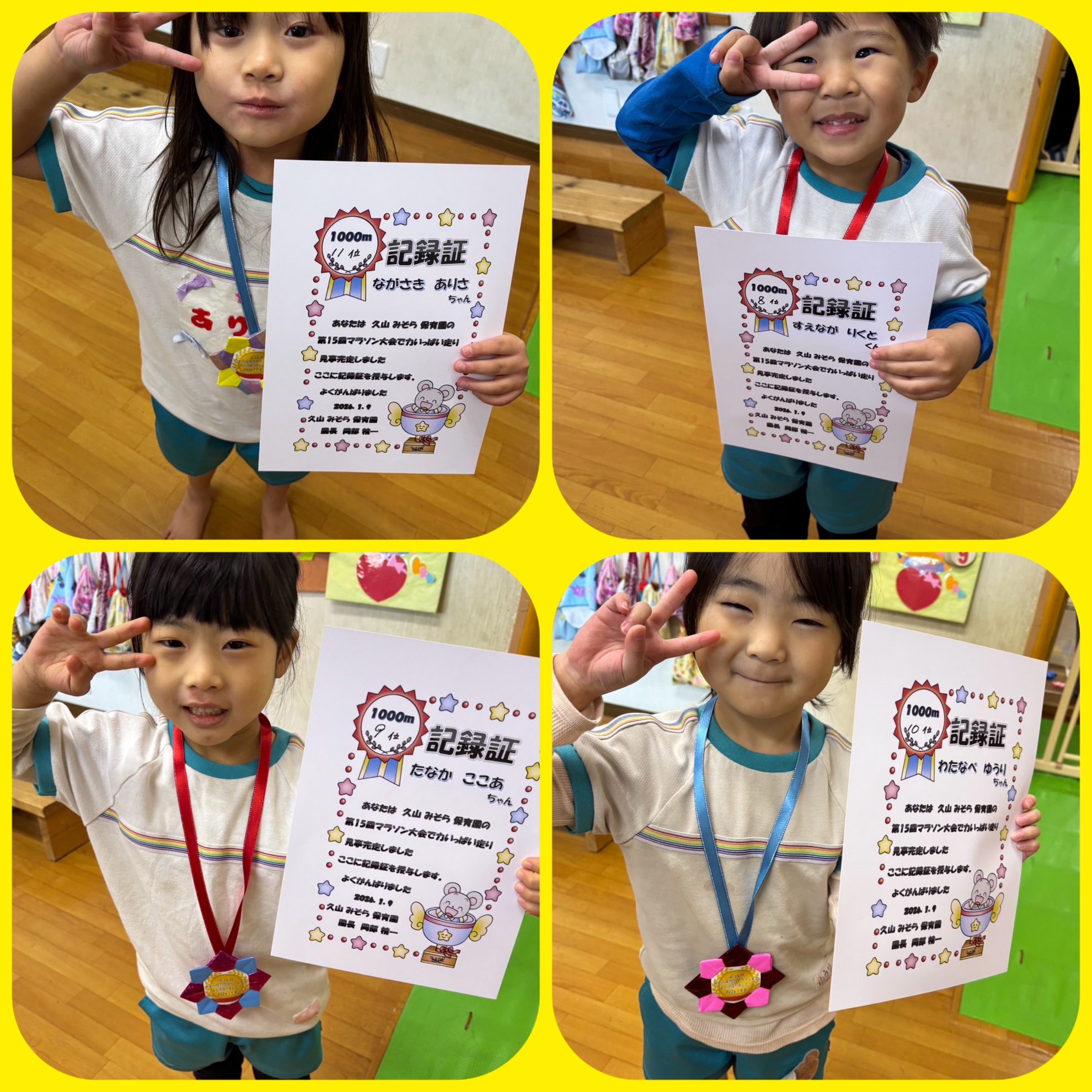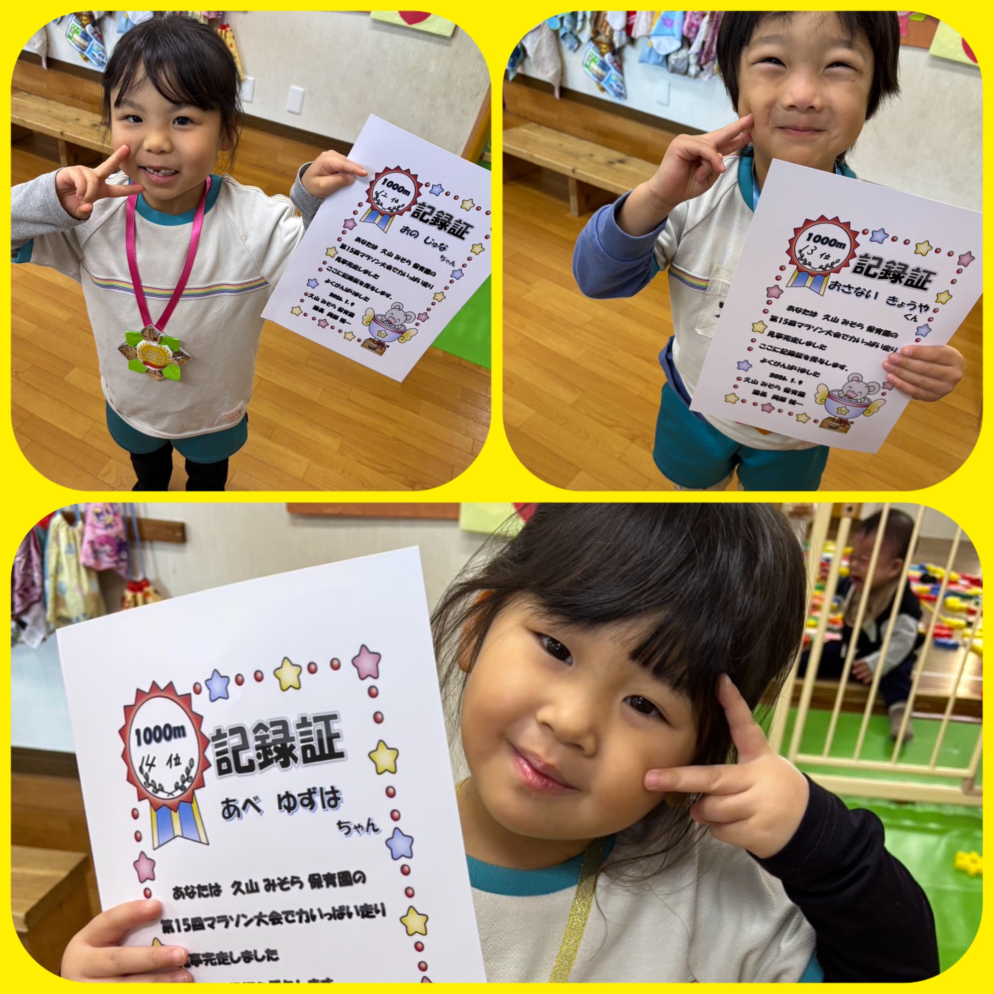 1月9日(金) 第15回マラソン大会 今日は 第15回みそら保育園 マラソン大会でした! 練習を頑張っていた 子供たち! お天気にも恵まれ 大好きな お母さん、お父さんが 見守る中 とても頑張りました! 練習では転んだり 少し歩いたり していた子供たちですが 本番は最後まで しっかりと走り切りした! 表彰式では 園長先生から 賞状をもらい 1位から3位のお友達は トロフィーも一緒に もらいました! 賞状を手にした子供たちは とてもいい笑顔でした! 保護者の皆様も 寒い中 たくさんの応援 ありがとうございました! カテゴリー:みそらブログ 投稿日:2026年01月09日 前へ次へ