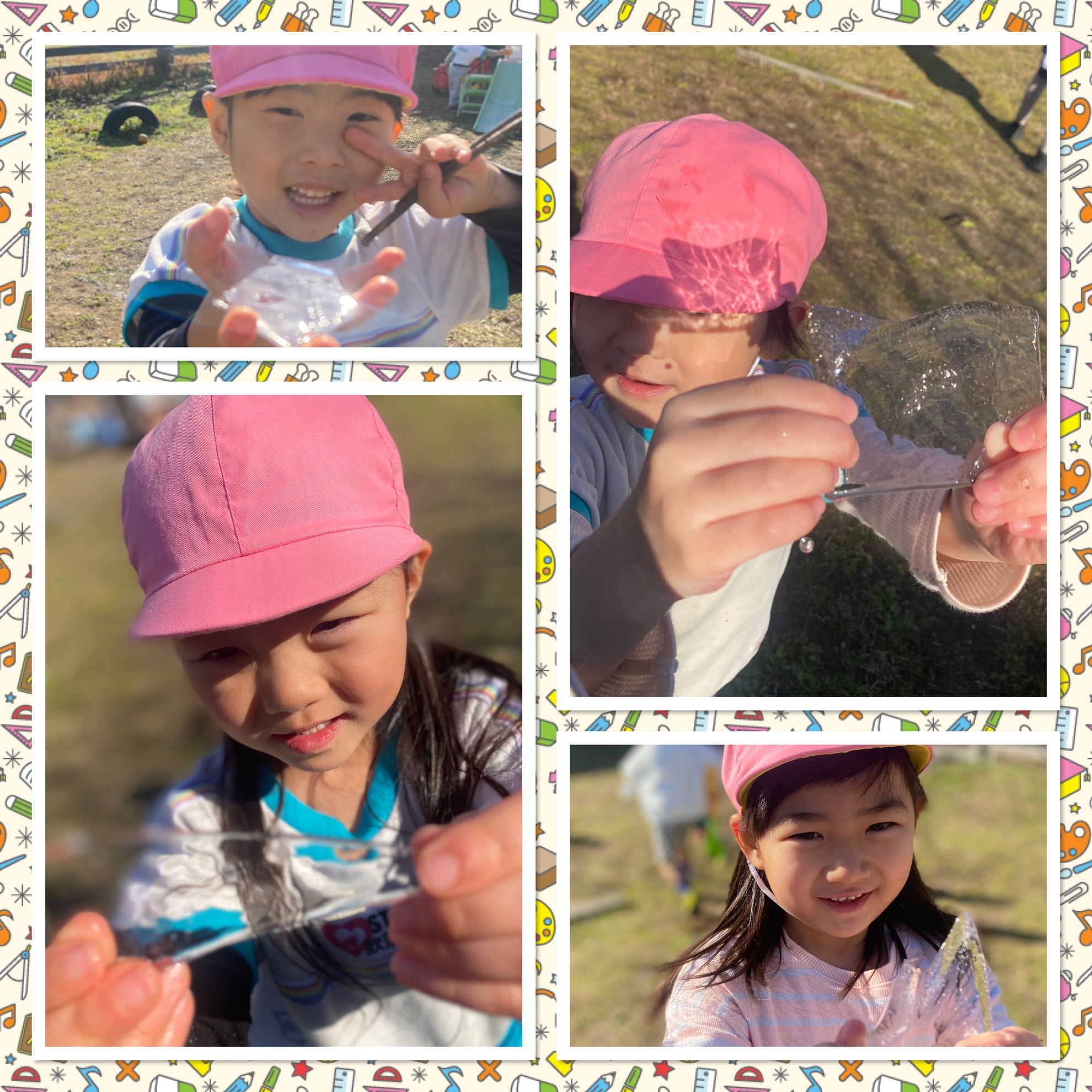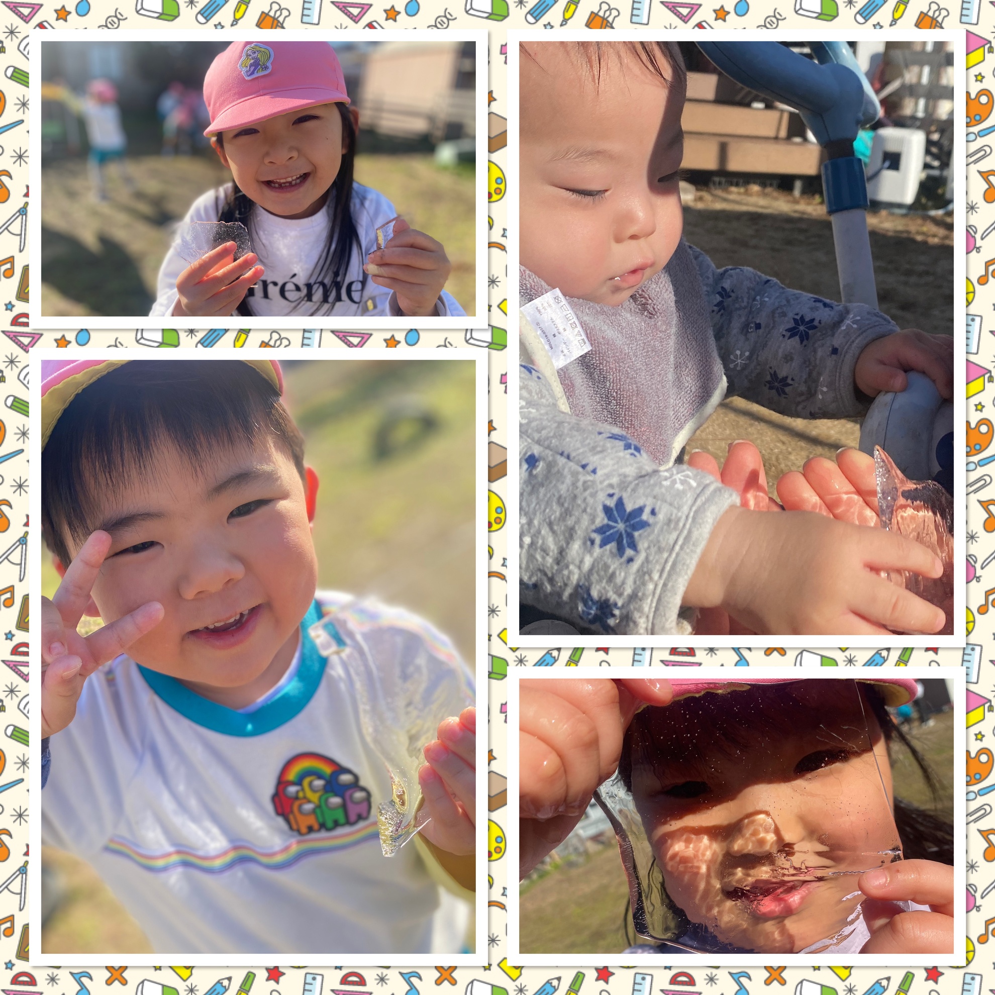 1月14日(水)寒い日の楽しみ♡ 園庭の水たまりに 氷が張っているのを 発見しました☆ 太陽の光でキラキラと 輝く氷はとてもきれい! 子どもたちの目もキラキラです♡ つめたーーーい!と 嬉しそうでした(*´ ˘ `*)ウフフ♡ 寒い冬ならではの 楽しみを味をことができました★ カテゴリー:みそらブログ 投稿日:2026年01月14日 前へ次へ