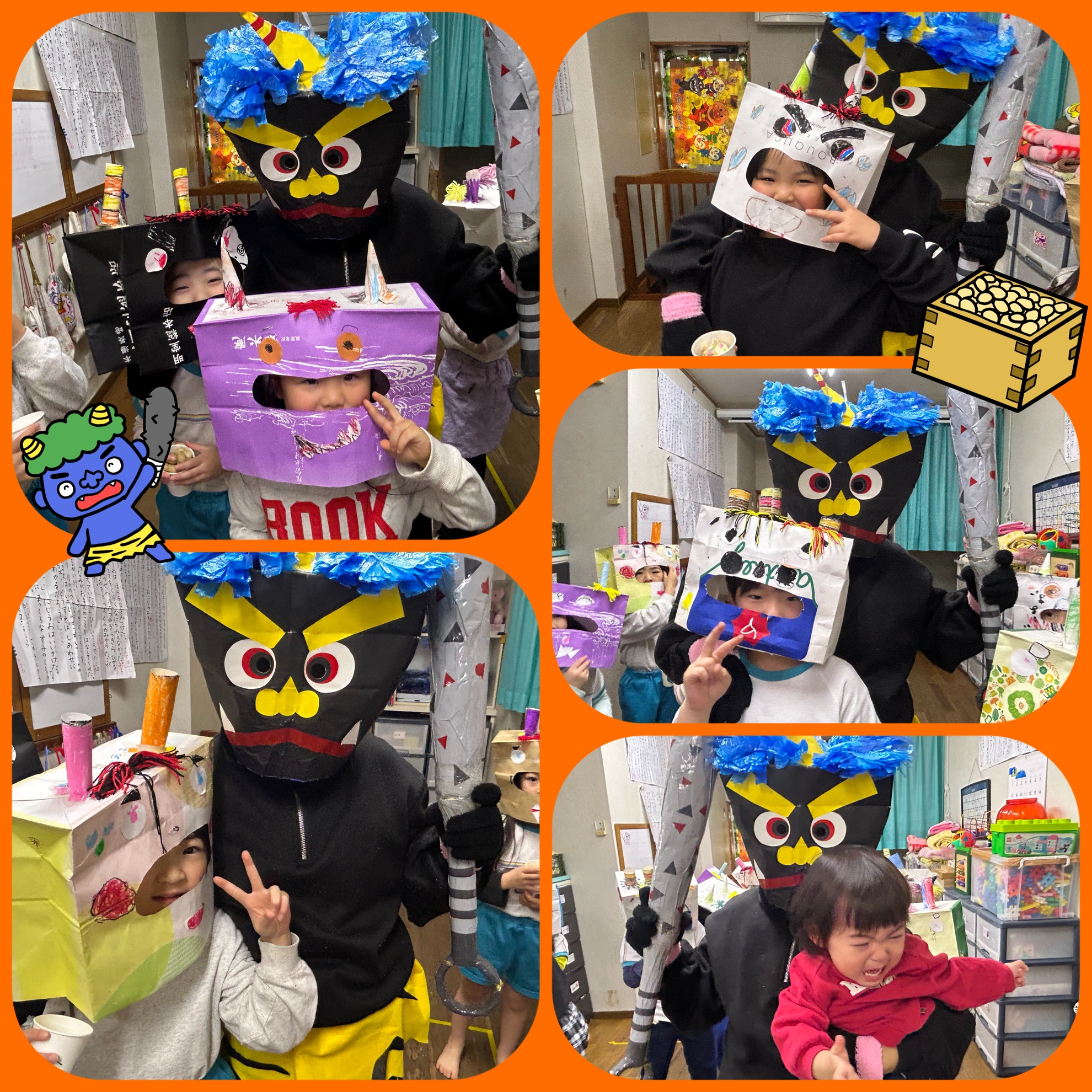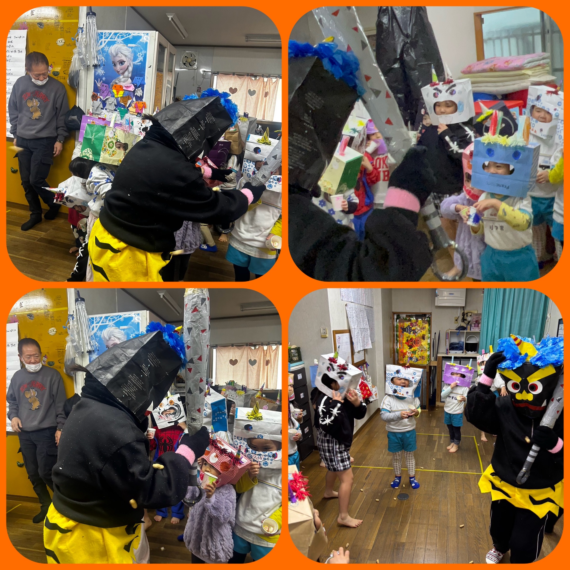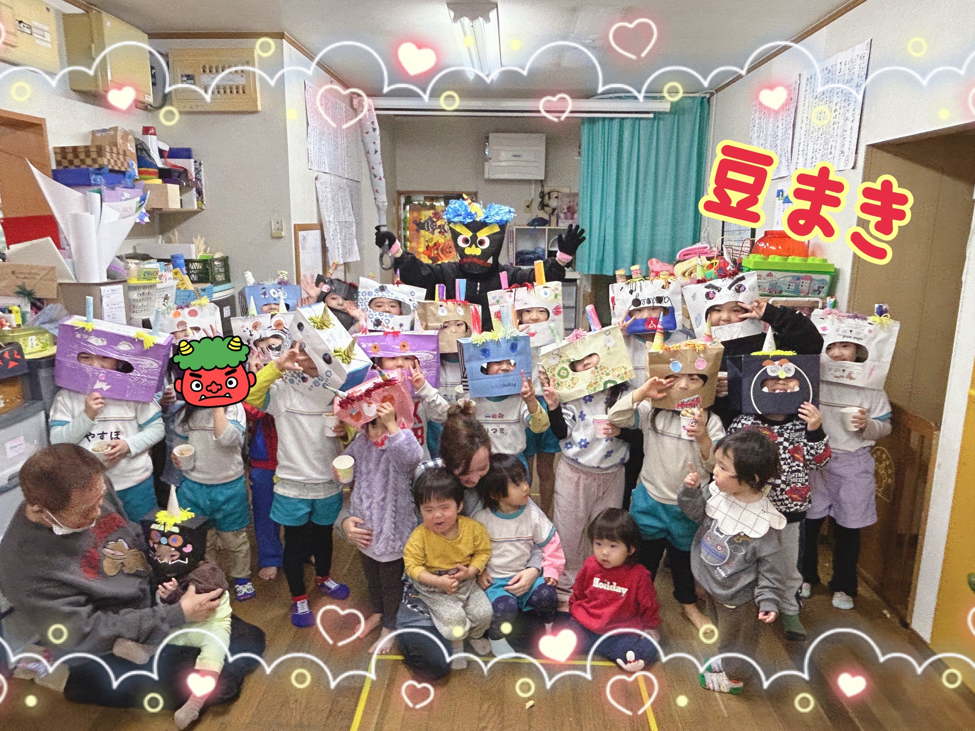 2月5日(木) 豆まき! 今日は待ちに待った 豆まきの日! みんなで製作した 鬼のお面を被って 記念撮影! 可愛く、かっこよく ポーズを決めて いました! お豆を先生からもらって 鬼退治の準備はOK! 鬼の正体がわかっていても 怖いものは怖い子供たち 勇気のあるお友達は前に出て 鬼は〜外 と鬼に豆を投げていました! 怖いお友達は 先生や 豆を投げているお友達の 後ろに隠れて 逃げていました! 泣いちゃうお友達もいたけど みんなで鬼さんをやっつけました! そして みんなの中にいる鬼さんも バイバイして 1年健康で過ごせますようにと お豆を食べました! 楽しい豆まきができました! カテゴリー:みそらブログ 投稿日:2026年02月05日 次へ
