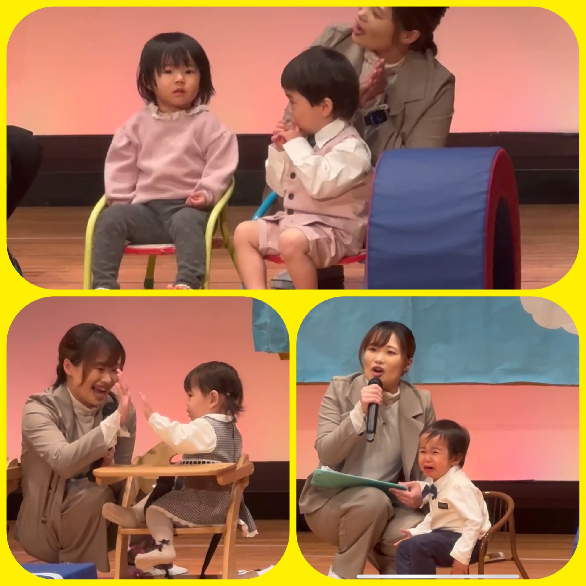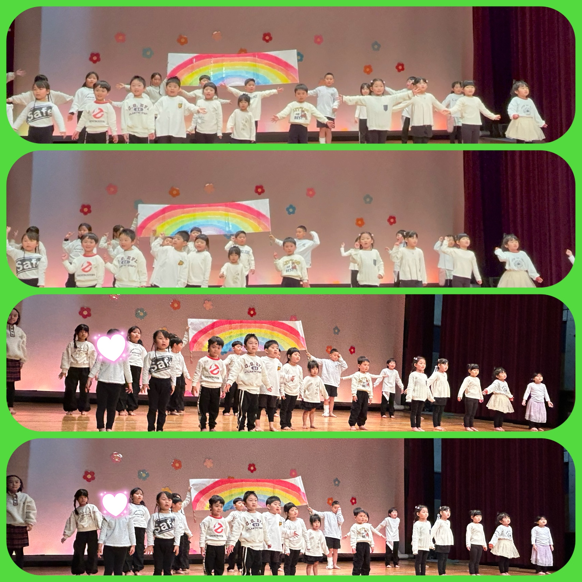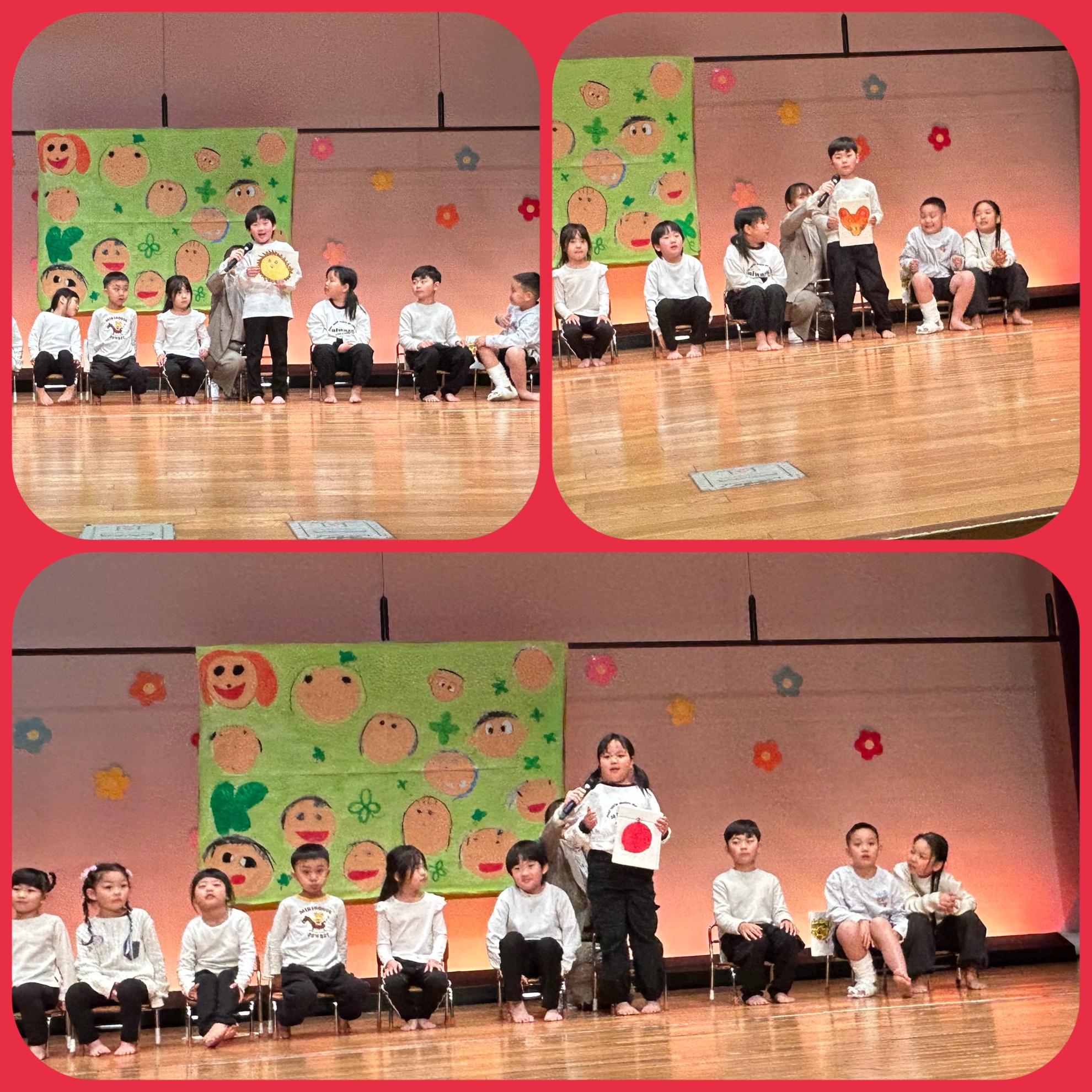 3月15日(日) 第24回みそら保育園生活発表会 3月15日(日)は 第24回みそら保育園生活発表会 今までの練習の成果を 沢山発揮しました プログラム1番は 小さいお友達の お返事はーい 涙を流しながら 頑張りました プログラム2番は 英語を受講しているお友達の発表でした 大きな声で頑張りました プログラム3番は はたらくくるま 練習で出していた 大きな声がしっかりと出ていました! プログラム4番は にじいろのさかな 沢山練習を、頑張った子供たち とても素晴らしい劇でした! プログラム5番は ダンス 2曲頑張って 踊った 年長さん、学童のお友達です! プログラム6番は 手話奏 虹 みんなで心をひとつにして 頑張りました、 カテゴリー:みそらブログ 投稿日:2026年03月15日 前へ次へ